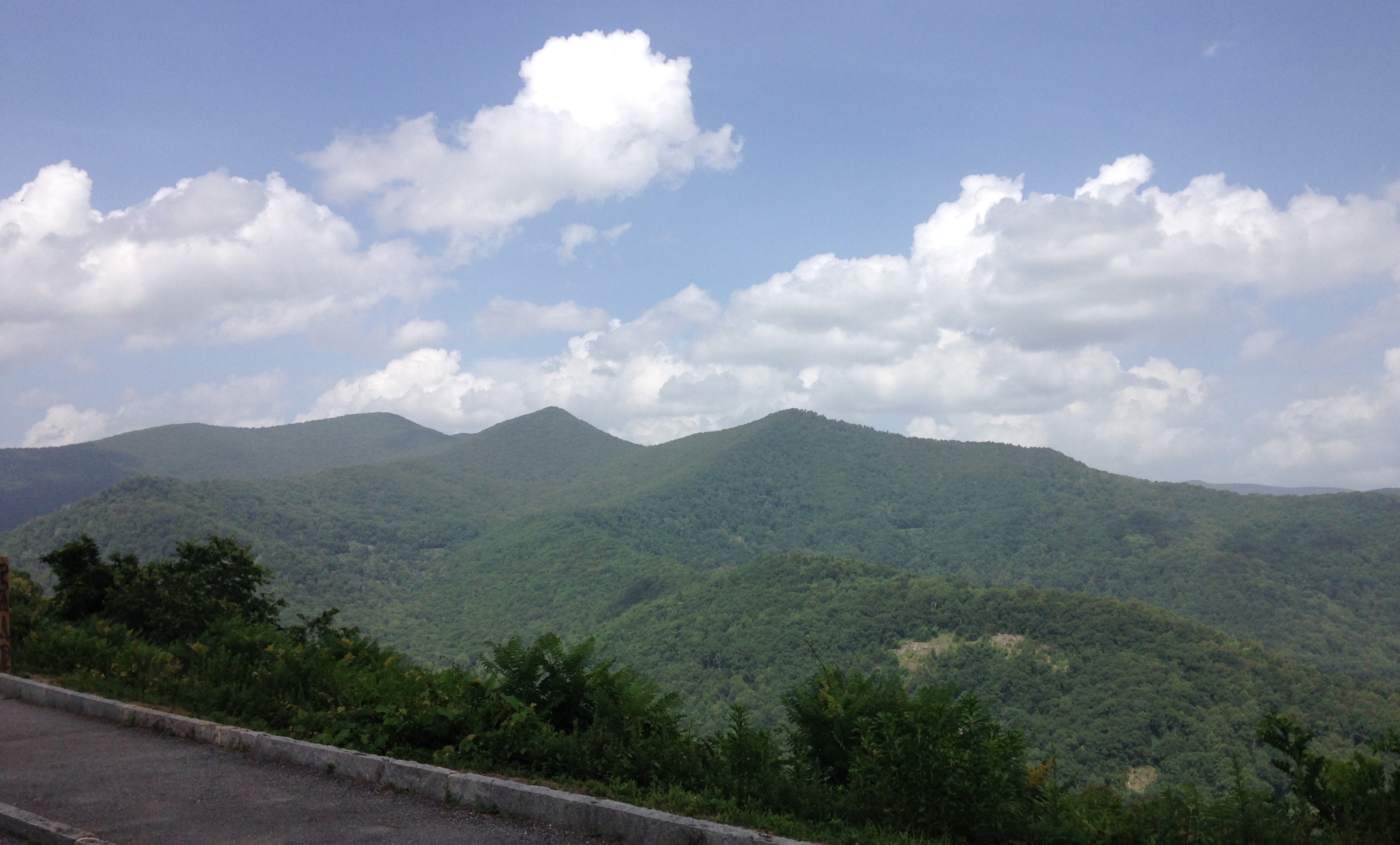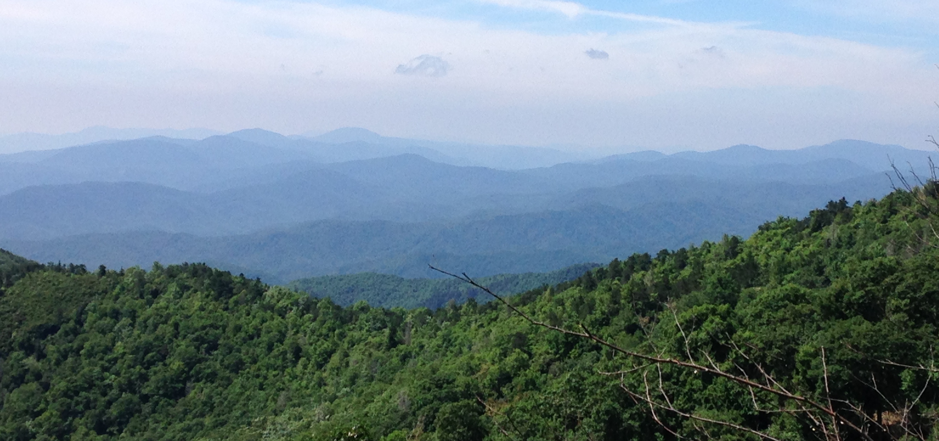 IMG_5903Soon I am on the road again, looking at a sky so blue it shocks my eyes. The wispy clouds create feather like shapes, as if God himself painted them. Up, up, up I go until I can see nearly 360 degrees, and at least 4 states. On the mountaintop everything below looks small. The rivers are like lines drawn by a child zig-zagging across the green carpet. The clouds create shadows on the mountains that move along silently giving depth to the scene. Light breaks through in spots causing the greens of the trees to radiate from the valleys below. In the distance a hazy horizon makes it difficult to determine where the mountains end and the sky begins. The purples, and grays, and blues make an exquisite tapestry. Each mountain has its place, its distinct shape, perfectly placed.