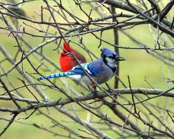A cardinal bright as holly berries flits from tree to tree and glides in front of my car when it pulls into the driveway. My eyes try to track it, but it moves too fast. Getting out of the car, I stand, waiting silently. There is a flash of red in my peripheral vision. I turn and it is gone. Then on the other side, blue. I freeze in place, waiting. Among the tree skeletons I see them and it appears they are playing hide and seek with me. I lean back onto my car and gaze up, staring ahead trying to rest in the moment, to slow my frantic attempts to “catch” them and allow them to come close. They do not disappoint. A blue jay and a cardinal. Others join them at a distance. The trees look as if they are frozen in time. No movement, only dark arms stretching to the sky. The birds know this and come to sit on branches, scouting for winter food. I watch thinking that in this barren winter landscape a brush or two of color makes all the difference. God always provides color, even in the most drab of places…and for that I am thankful.