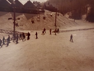 There was a whole group of “regulars” who met at the slopes each weekend. I think we pretty much terrorized everyone around us. We made little jumps and then lined up to take them and see who could get highest. In our minds, we were Olympic ski jumpers. (I’m pretty sure I got maybe a few inches off the ground.) We skied with poles and without. We zigzagged across the slope trying to make the run take longer than 2 minutes. Or we skied straight down wide open to see if we could make it down in 30 seconds or less. When the lift line got partway up the slope, we would come sliding in and the line of people went down like dominos.
